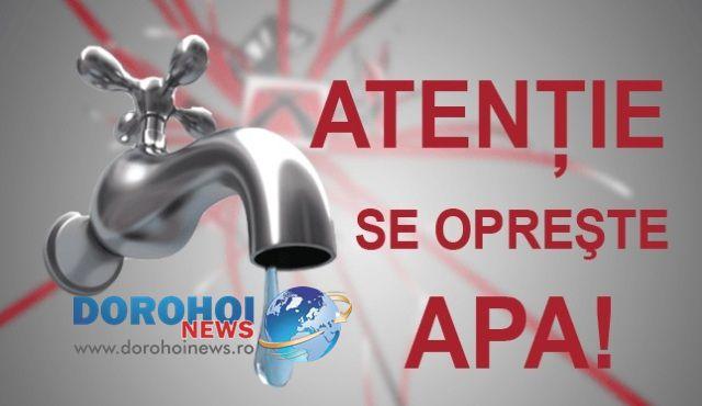 S.C. Nova Apaserv S.A. Botoșani anunță că joi 30 iulie 2015, întrerupe furnizarea apei în zona „Pod Botosani’’ din municipiul Dorohoi, din cauza unei avarii apărută la conducta de distribuție din PEHD Ø400 mm.