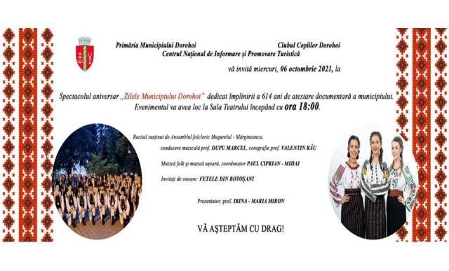 De apropae jumătate de secol domnul prof. Marcel Dupu coordonează ansamblul reușind cu succes să descopere și să cultive talentul autentic, să păstreze și să promoveze autenticul popular al acestui ținut. Prin urmare vă invităm, miercuri 06 octombrie 2021, ora 18:00, la Sala Teatrului din Dorohoi, la un regal muzical, prilejuit de această mare sărbătoare ,,Zilele Municipiului Dorohoi’’.