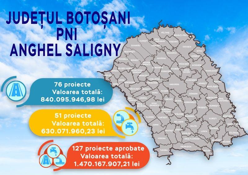 127 de proiecte de investiții în drumuri, apă și canalizare depuse de către autoritățile locale din județul Botoșani au fost aprobate de către Ministerul Dezvoltării, Lucrărilor Publice și Administrației și vor primi finanțare prin intermediul Programului Național de Investiții „Anghel Saligny”. Valoarea totală a acestor proiecte se ridică la 1,47 de miliarde de lei, adică aproximativ 300 de milioane de euro.