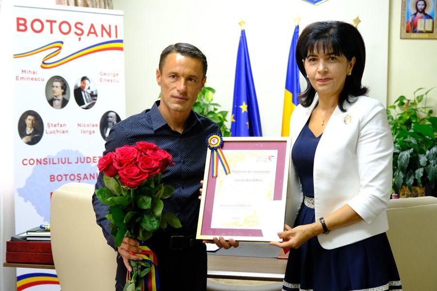 După o scurtă trecere în revistă a palmaresului de invidiat al lui Iulian Rotariu, Doina Federovici i-a înmânat o diplomă de excelență și „Flacăra speranței”, un trofeu pe care autoritatea județeană îl oferă celor care duc faima Botoșaniului în întreaga lume. „Pot fi spuse multe cuvinte despre Iulian Rotariu, dar oricum sunt prea sărace pentru ceea ce reprezintă el pentru sport, dar mai ales pentru copiii cu autism pentru care aleargă”, a mai spus Doina Federovici.