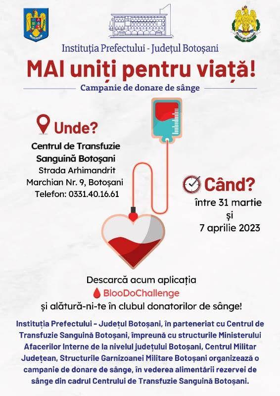 Instituția Prefectului Județul Botoșani, în parteneriat cu Centrul de Transfuzie Sanguină Botoșani, împreună cu structurile Ministerului Afacerilor Interne de la nivelul județului Botoșani, structurile Ministerului Apărării Naționale de la nivelul județului Botoșani, lansează o campanie de donare de sânge. Scopul campaniei îl reprezintă creșterea numărului de donatori pentru asigurarea rezervelor de sânge existente în cadrul Centrului de Transfuzie Sanguină Botoșani.