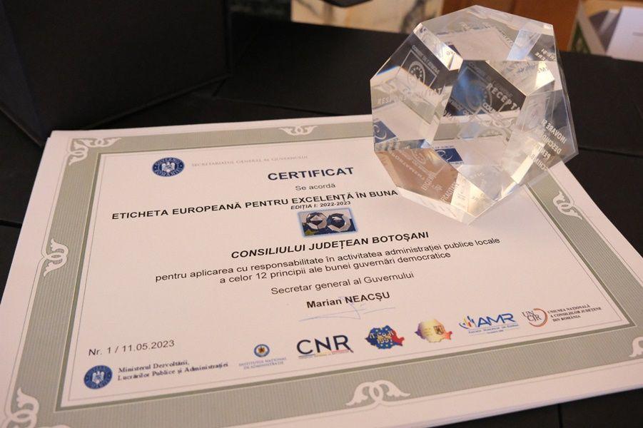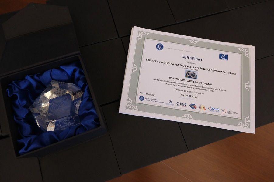 Consiliul Județean Botoșani a primit, joi, 11 mai 2023, la sediul Guvernului României, eticheta ELoGE, Eticheta Europeană pentru Excelență în Guvernare acordată de Consiliul Europei celor mai bune administrații locale. Premiile pentru cele mai performante administrații publice locale din țară au fost înmânate, în cadrul primei ediții a Galei ELoGE România, de către Daniel Popescu, șeful Direcției de Guvernare Democratică din cadrul Consiliului Europei, și Marian Neacșu, secretarul general al Guvernului.