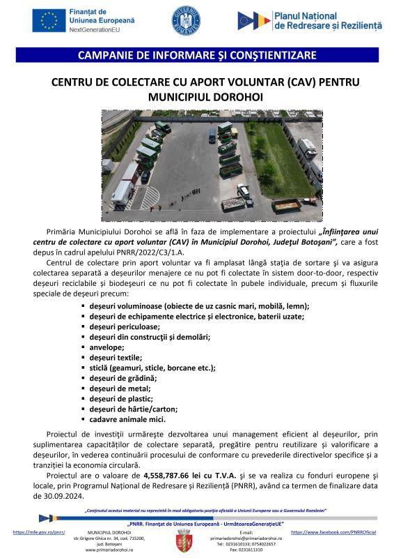 Primăria Municipiului Dorohoi se află în faza de implementare a proiectului „Înfiinţarea unui centru de colectare cu aport voluntar (CAV) în Municipiul Dorohoi, Judeţul Botoşani”, care a fost depus în cadrul apelului PNRR/2022/C3/1.A.