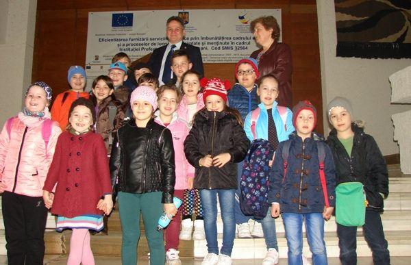Elevii au fost invitaţi de prefectul Dan Nechifor în biroul său, dar şi în sălile de şedinţe ale palatului administrativ, însă o instituţie precum Prefectura li s-a părut destul de „dificilă” musafirilor. Aceştia au arătat că ştiu să intoneze imnul României, dar şi că pot pune foarte multe întrebări.