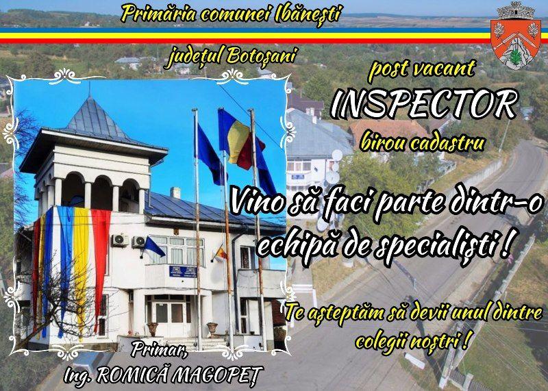 Primaria comunei Ibanesti, judetul Botosani organizeaza in data de 21.08.2023, ora 10.00 concurs pentru ocuparea functiei publice de inspector, clasa I, grad profesional debutant, birou cadastru.