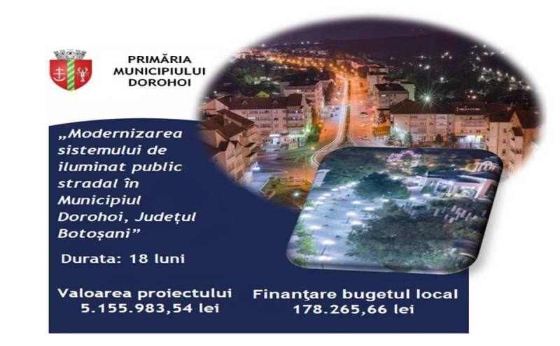 Primăria Municipiului Dorohoi vă informează că în curând va începe execuția lucrărilor la proiectul de investiții „Modernizarea sistemului de iluminat public stradal în Municipiul Dorohoi”, cu fonduri în valoare de 5.155.983,54 lei, atrase de la Administrația Fondului pentru Mediu prin contractul de finanțare semnat de primarul Dorin Alexandrescu și echipa sa.