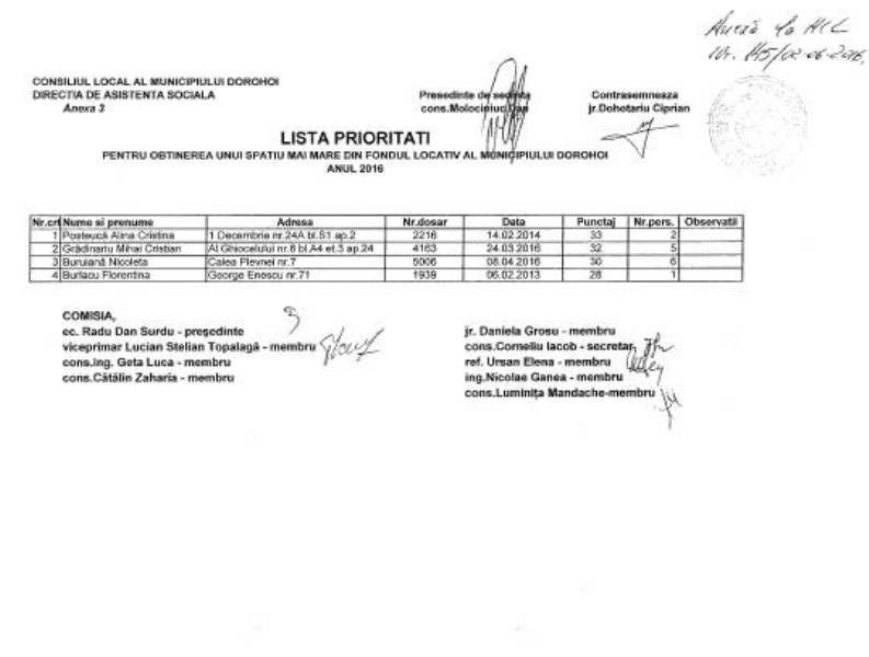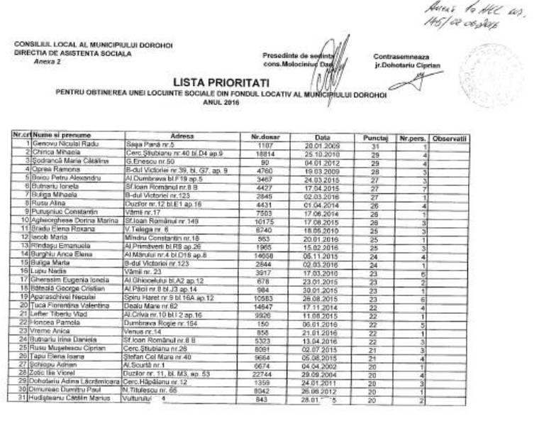 Primăria Municipiului Dorohoi a făcut publică Hotărârea 145/02.06.2016, privind aprobarea listelor de priorități pentru anul 2016 în vederea repartizării locuințelor din fondul locativ aparținând domeniului privat al Municipiului Dorohoi în regim de închiriere și a locuințelor sociale din fondul locativ aparținând domeniului public al municipiului Dorohoi.