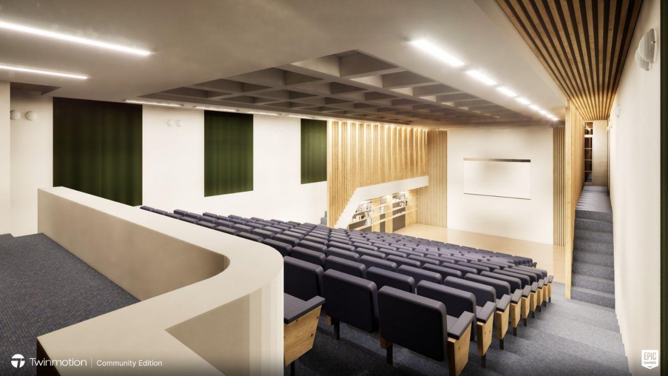Noile dotări includ: un sistem de iluminare multifuncțional, adaptat pentru diversele activități desfășurate în amfiteatru, un sistem audio-video de ultimă generație și mobilierul necesar — scaune, birouri și rafturi pentru cărți. De asemenea, va fi modernizat sistemul de încălzire, iar ușile de acces și blaturile ferestrelor vor fi înlocuite pentru a reduce pierderile de căldură.