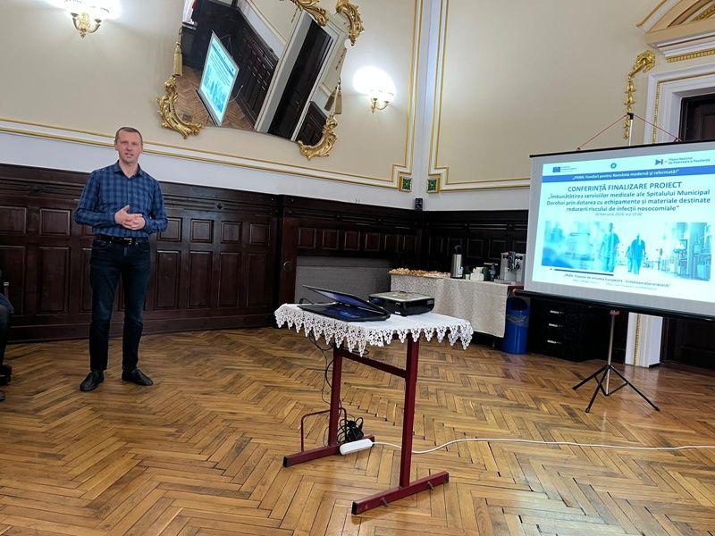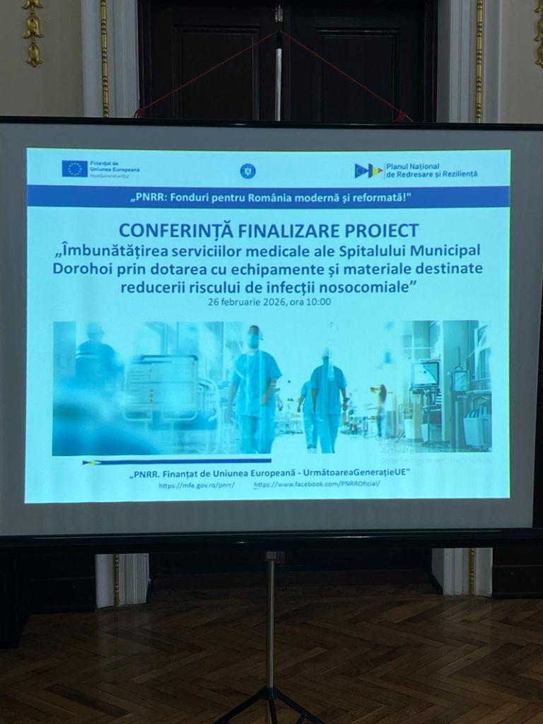 În data de 26 februarie 2026 a avut loc conferința de finalizare a proiectului „Îmbunătățirea serviciilor medicale ale Spitalului Municipal Dorohoi prin dotarea cu echipamente și materiale destinate reducerii riscului de infecții nosocomiale”, implementat de U.A.T. Municipiul Dorohoi în parteneriat cu Spitalul Municipal Dorohoi și finanțat prin Planul Național de Redresare și Reziliență – Componenta Sănătate.