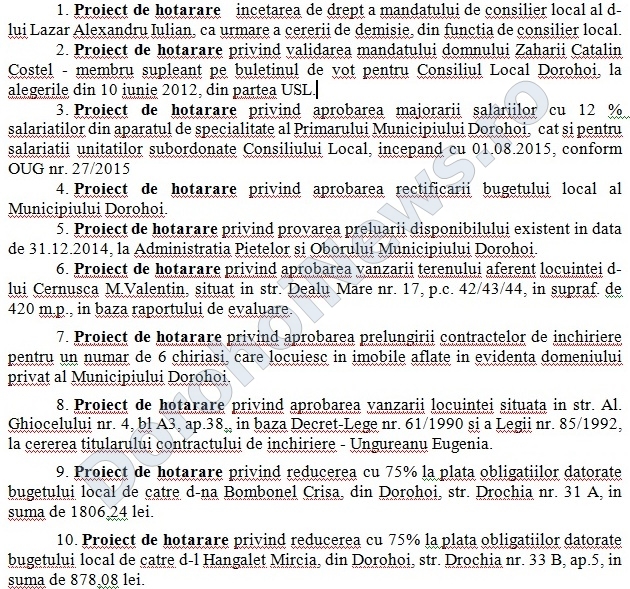 Consilierii dorohoieni s-au întrunit joi, 27 august 2015, începând cu ora 15:00, la Casa Municipală de Cultură Dorohoi, în şedinţa ordinară din luna august.