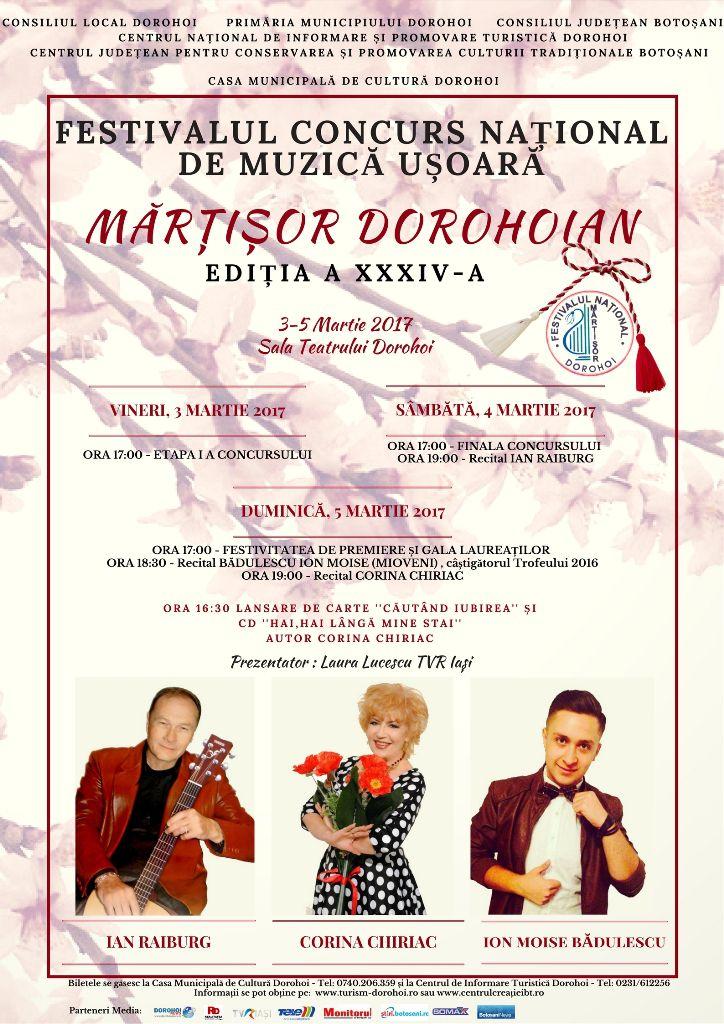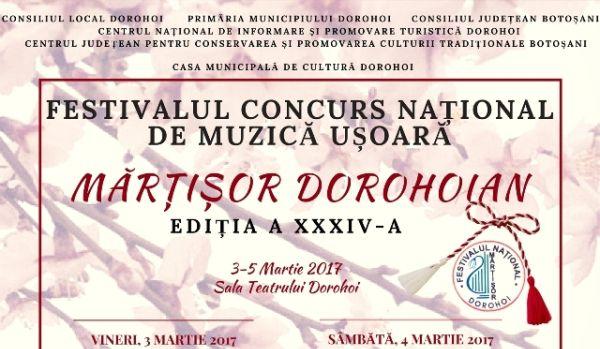Primăria Municipiului Dorohoi, Consiliul Local Dorohoi, Casa Municipală de Cultură Dorohoi, în colaborare cu Centrul Judeţean pentru Conservarea şi Promovarea Culturii Tradiţionale Botoşani, cu sprijinul Consiliului Judeţean Botoşani, organizează în perioada 3– 5 martie 2017 la Sala Teatrului Dorohoi, cea de-a XXXIV-a ediţie a Festivalului - Concurs Naţional de Muzică Uşoară Româneasc „MĂRŢIŞOR DOROHOIAN”.