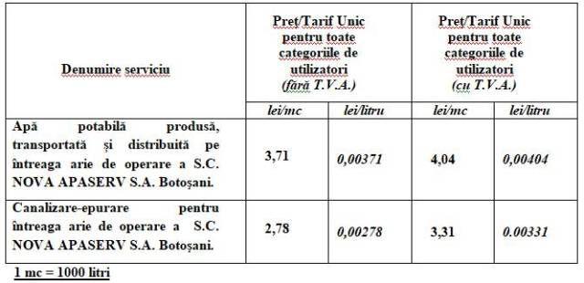 S.C. NOVA APASERV S.A. Botoşani aduce la cunoștința utilizatorilor serviciilor publice de alimentare cu apă potabilă şi de canalizare-epurare noile prețuri și tarife unice la apă și canalizare-epurare aplicate începând cu data 01 decembrie 2017 aprobate de Adunarea Generală a Asociației de Dezvoltare Intercomunitară „AQUA Botoșani” prin Hotărârea nr. 127/12.12.2017 și avizate de Autoritatea Națională de Reglementare pentru Serviciile Comunitare de Utilități Publice prin Avizul nr. 511283/24.10.2017.