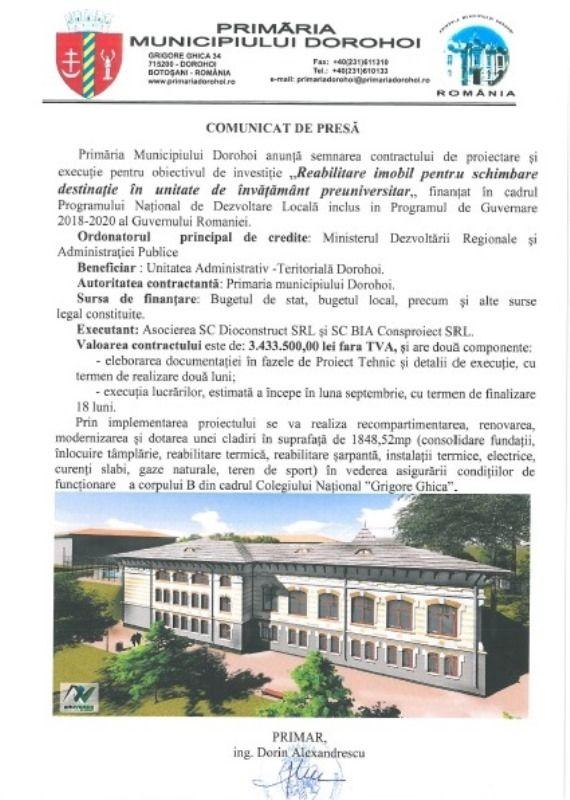 Primăria Municipiului Dorohoi anunță semnarea contractului de proiectare și execuție pentru obiectivul de investiție „Reabilitare imobil pentru schimbare destinaţie în unitate de învăţământ preuniversitar” finanțat în cadrul Programului Național de Dezvoltare Locală inclus in Programul de Guvernare 2018-2020 al Guvernului Romaniei.
