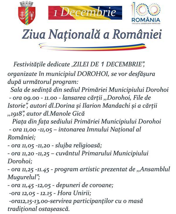 Primăria municipiului Dorohoi anunță cetățenii că sâmbătă, 1 decembrie 2018, începând cu ora 11:00 în fața primăriei din strada Grigore Ghica nr. 34 se vor organiza o serie de manifestări ce vor marca ZIUA NAŢIONALĂ A ROMÂNIEI.