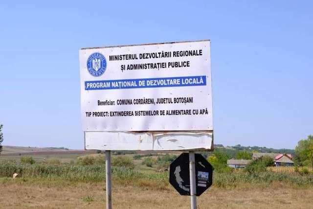 Înființarea rețelei de apă potabilă de 15 km în toate satele componente ale comunei Cordăreni, investiție realizată cu fonduri guvernamentale prin Programul Național de Dezvoltare Locală, etapa a doua este extrem de necesară în condițiile în care în prezent, alimentarea se face prin fântâni, săpate în gospodăriile populației.
