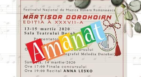 Centrul Național de Informare și Promovare Turistică Dorohoi anunță toate persoanele care dețin bilete la Festivalul Național de Muzică Ușoară Românească „Mărțișor Dorohoian” că restitituirea acestora se va face până miercuri 18 martie 2020, în intervalul orar 08:00 - 10:00.