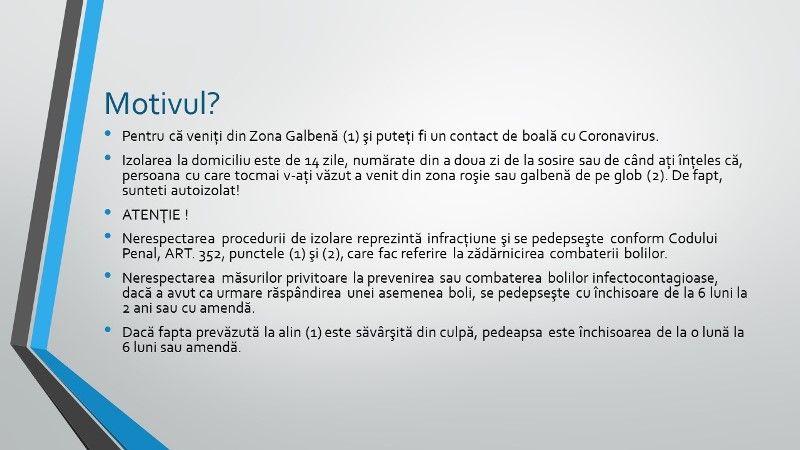 Pentru că veniţi din Zona Galbenă (1) şi puteţi fi un contact de boală cu Coronavirus.
