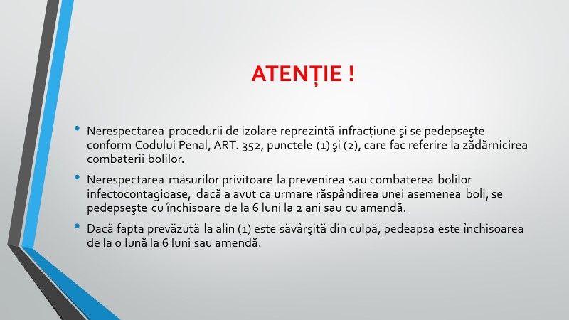 Nerespectarea procedurii de izolare reprezintă infracţiune şi se pedepseşte conform Codului Penal, ART. 352, punctele (1) şi (2), care fac referire la zădărnicirea combaterii bolilor.