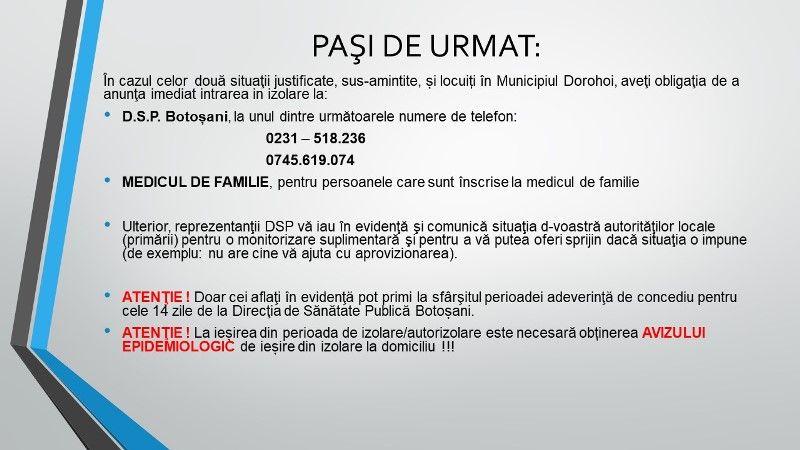 În cazul celor două situaţii justificate, sus-amintite, și locuiți în Municipiul Dorohoi, aveţi obligaţia de a anunţa imediat intrarea in izolare la: