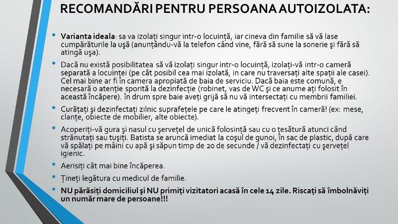 RECOMANDĂRI PENTRU PERSOANA AUTOIZOLATĂ:
