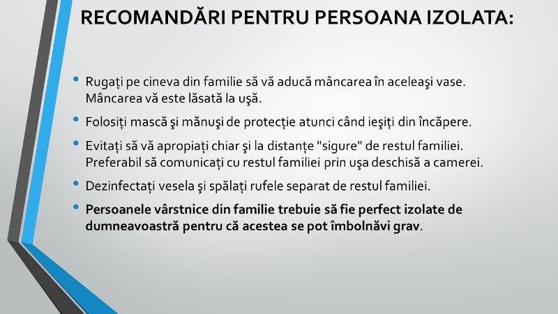 - Dacă nu există posibilitatea să vă izolaţi singur intr-o locuinţă, izolaţi-vă intr-o cameră separată a locuinţei (pe cât posibil cea mai izolată, in care nu traversaţi alte spaţii ale casei). Cel mai bine ar fi în camera apropiată de baia de serviciu. Dacă baia este comună, e necesară o atenţie sporită la dezinfecţie (robinet, vas de WC şi ce anume aţi folosit în această încăpere). în drum spre baie aveţi grijă să nu vă intersectaţi cu membrii familiei.
