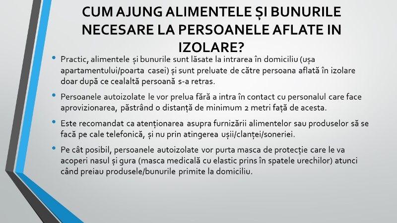 Persoanele autoizolate le vor prelua fără a intra în contact cu personalul care face aprovizionarea, păstrând o distanță de minimum 2 metri față de acesta.