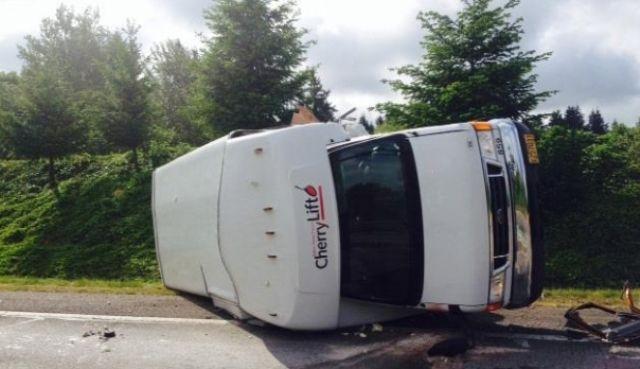 Un microbuz de tip Mercedes 412 având la bord cinci bărbaţi şi două femei, cetăţeni români, a lovit balustrada de siguranţă a autostrăzii şi s-a răsturnat.