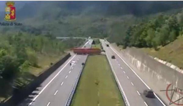 Un român șochează din nou Italia. Bărbatul, șoferul unui camion de marfă înmatriculat în România a efectuat o manevră periculoasă pe o autostradă, strecurându-se printr-un pasaj situat între cele patru benzi de circulaţie după ce şi-a dat seama că a greşit drumul.
