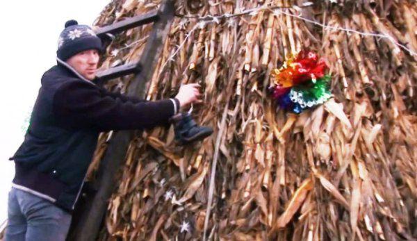 „Ăsta e bradul de Anul Nou, făcut din ciocleji. L-am împodobit cu ce am găsit pe-acasă. Când se întunecă, facem inaugurarea bradului, cu vin fiert, tradițional. Doritorii să îl vadă au la dispoziție 10-15 zile, că de nu, văcuța mea începe a mânca bradul. Veniți să-l vizitați, intrarea este liberă", spune autorul, în film. Sursa: realitatea.net