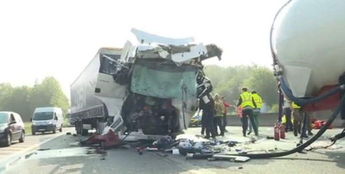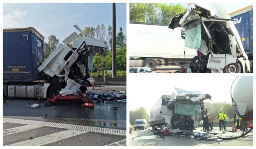 Cabina camionului românesc a fost distrusă complet și, în impact, camionul francez a lovit parapetele de pe axul autorsătăzii şi camionul italian din faţă. Șoferul francez este rănit, românul este mort.