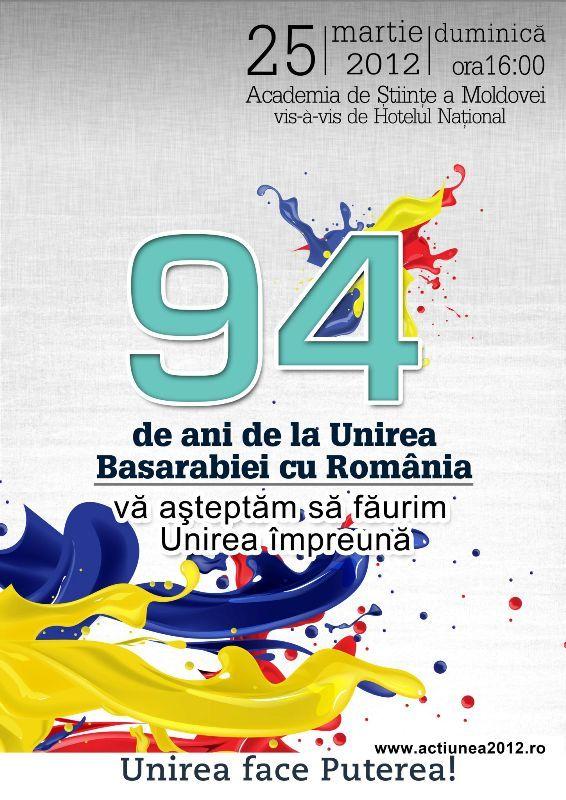 Peste 500 de voluntari ai Platformei civice Acţiunea 2012 vor sărbători duminică pe străzile din Chişinău împlinirea a 94 de ani de la unirea Basarabiei cu România. Lor li se vor alătura membrii altor organizaţii unioniste de peste Prut, care se solidarizează pentru prima dată în cadrul aceluiaşi eveniment.