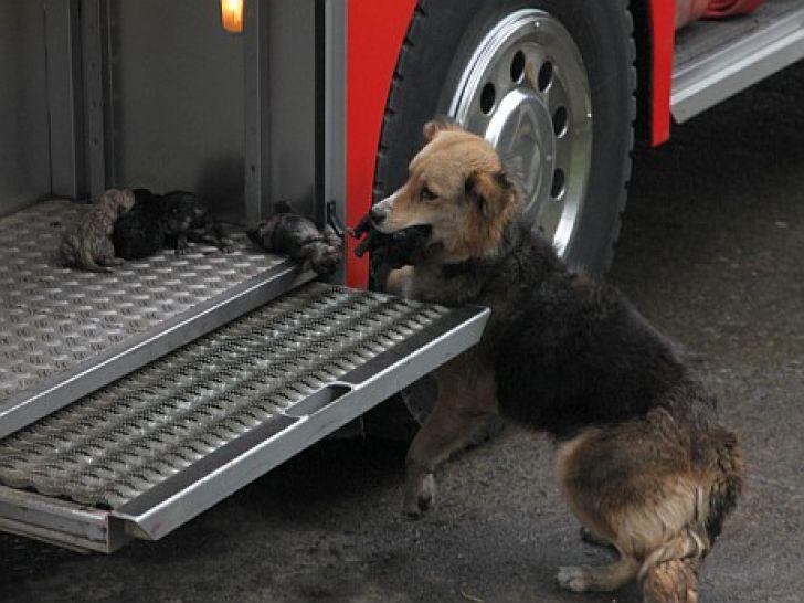 Fotografiile în care putea fi văzută o căţeluşă care îşi salva puiuţii dintr-un incendiu şi îi ducea în cel mai sigur loc posibil, în maşin pompierilor, au făcut furori sâmbătă pe site-ul Reddit.