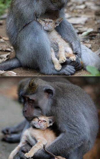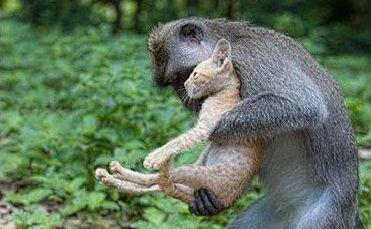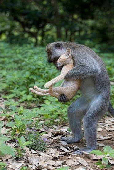 Macacul se plimba prin padure ca in orice alta zi, cand a observat pe marginea drumului un pui de pisica, lovit de o masina.