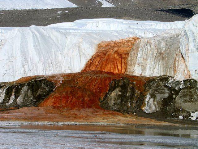 Acum circa două milioane de ani, un lac ce conţinea microbi a fost prins sub gheţar. Fără lumină, fără oxigen şi căldură, organismele au putut, totuşi, să supravieţuiască. Fiind precum o capsulă a timpului, microbii au continuat să trăiască în apa care conţinea o cantitate mare de sare şi de fier. Fierul oferă culoarea inedită, la fel cum face şi în sângele uman. O fisură în gheţar permite lacului să curgă afară, expunând micile extremofile luminii, fără să contamineze mediul lor unic. Gheţarul este un exemplu incredibil al modului în care viaţa poate continua în cele mai extreme condiţii de pe Pământ.