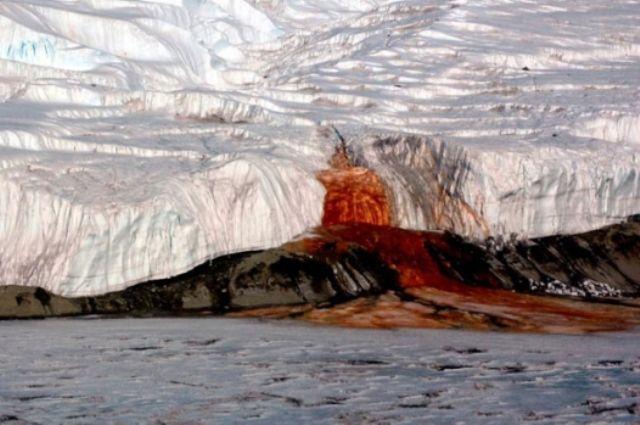Cascada roşie, poreclită "Cascada însângerată", este înaltă cât o clădire cu cinci etaje şi iese printr-o crăpătură în gheaţă. Geologii credeau iniţial că culoarea apei vine de la alge, însă nuanţa roşiatică este dată, de fapt, de microbi.