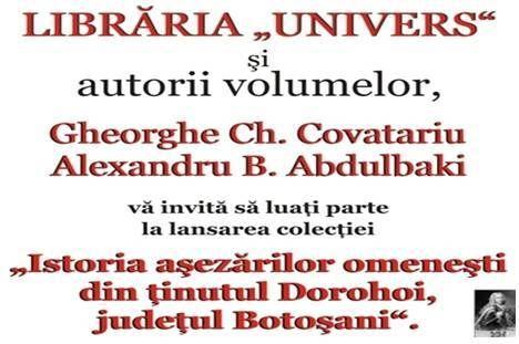 Alexandru B. Abdulbaki și Gheorghe Gh. Covatariu, vă invită să luați parte la lansarea colecției „Istoria așezărilor omenești din ținutul Dorohoi, județul Botoșani”