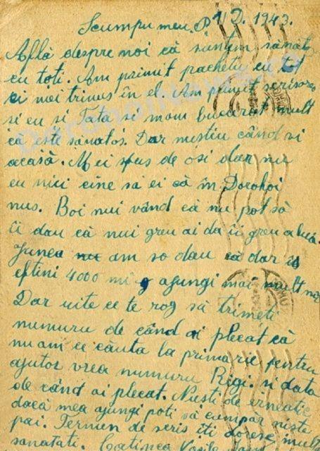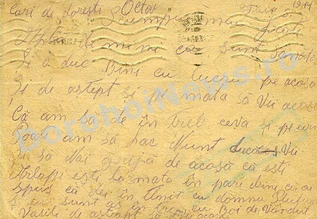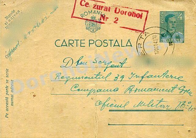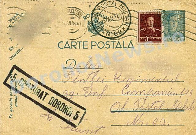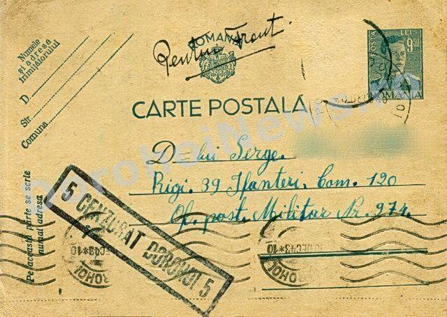 Aşadar, am primit la redacţie, cu sprijinul profesorului Octavian Vitcu din Ibăneşti, trei cărţi poştale care poartă datele poştei – 17 octombrie 1941 - 10 decembrie 1943 – 5 ianuarie 1944. În plină era a tehnologiei, printre SMS-uri şi E-mailuri, astfel de cărţi poştale, trimise în perioada sus-menţionată, scoase la lumină acum, reproduc momente importante şi instantanee din viaţa celor care au trăit odinioară. Par, dar nu sunt, hârtii goale îngălbenite, consemnează mici declaraţii de dragoste, întrebări şi răspunsuri, formulări care, acum, par stângace. Aceste petice de hârtie, care la un moment dat, au reprezentat singura legătură dintre cel plecat şi cei ramaşi acasă, poartă o ştampilă mare „CENZURAT”, care ne întăreşte convingerea, că, strămoşilor noştrii nu le-a fost uşor.