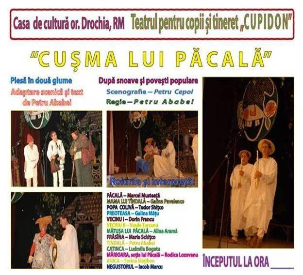 Va amintim ca, Sala teatrului din Dorohoi va gazdui astazi la orele 18:00, spectacolul "CUSMA LUI PACALA". Acest spectacol este sustinut de teatrul pentru copii si Tineret "CUPIDON" de la Casa de Cultura Drochia.