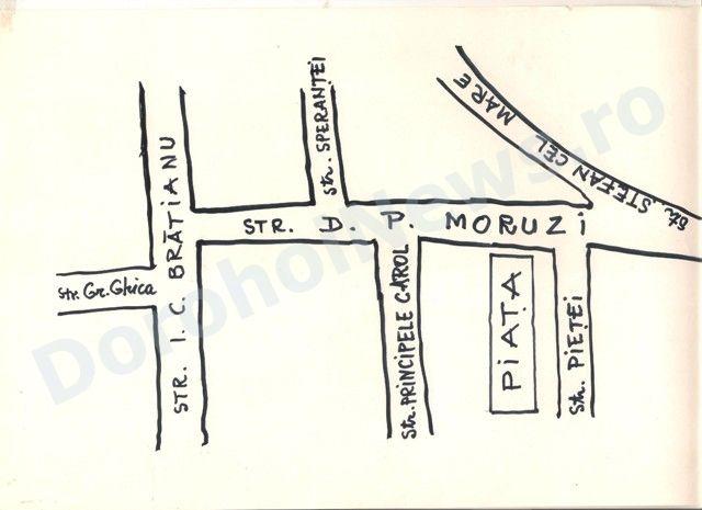 Strada D.P. Moruzi, venind dinspre strada Ştefan cel Mare, începea pe partea stângă cu casele Weiner (ulterior casele Marţiparu şi apoi sediul Comunităţii Israelite). Urma familia Rahmin Steiner, apoi strada Pieţei (azi Zadurovici), urmată de locuinţele Zailic Dulei, Iţic Spiegler, A. Pascariu şi Gh. Pârlogeanu. În continuare era piaţa de alimente.