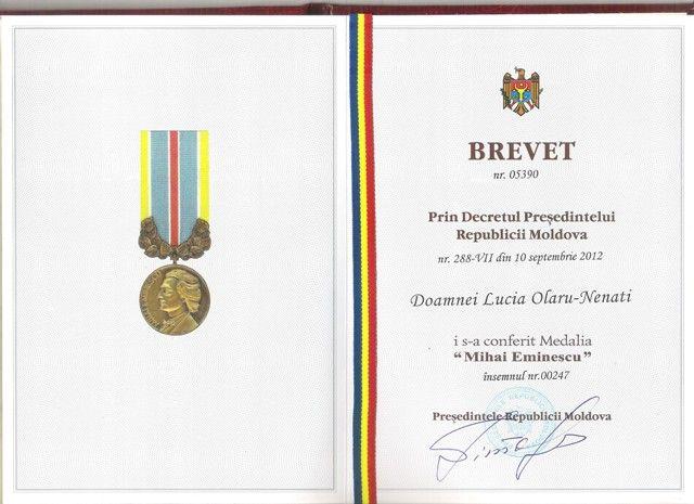 4. Medaliatii ciocnesc cupa de sampanie cu Presedintele tarii 2. Lucia Olaru Nenati decorata de Presedinele Republicii Moldova - Copie3. Lucia Olaru Nenati multumind pentru acordarea Medaliei M. Eminescu 5. Dupa decorare in fata Resedintei de Stat12. Medalia Congresului International al Eminescologilor, Chisinau, 20131. Brevetul si Medalia M. Eminescu, Chisinau, 2013