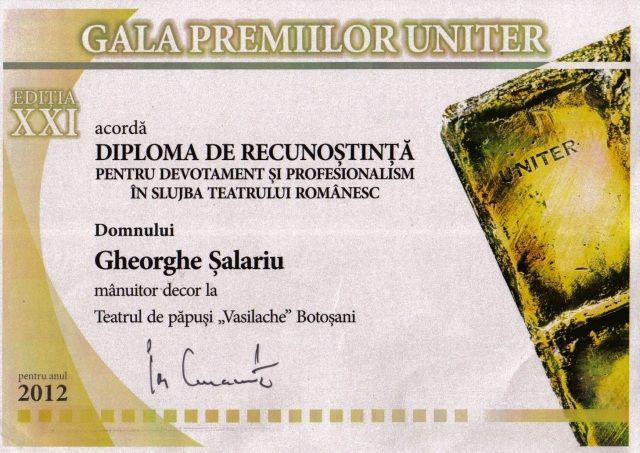 Pentru întreaga activitate desfăşurată în plan profesional şi performanţele obţinute colectiv, în urma numeroaselor participări la festivalurile de gen din ţară şi străinătate, urmare aprecierilor făcute de critica de specialitate, pentru devotamentul de o viaţă cu care şi-a pus vocaţia în serviciul  artei spectacolului şi publicului spectator, pentru măiestria de care a dat dovadă, domnul Gheorghe Şalariu a fost evidenţiat în cadrul Galei Premiilor UNITER, ca un devotat slujitor al  scenei româneşti, primind  Diploma de recunoştinţă  pentru devotament şi profesionalism în slujba teatrului românesc.