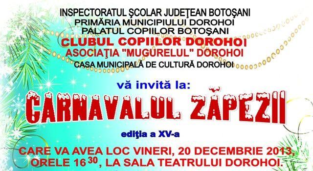 La Sala Teatrului din Dorohoi, vineri, 20 decembrie 2013, începând cu ora 16:30, va avea loc concertul tradiţional de sărbători al Clubului Copiilor Dorohoi „Carnavalul Zăpezii", ediţia a XV-a.