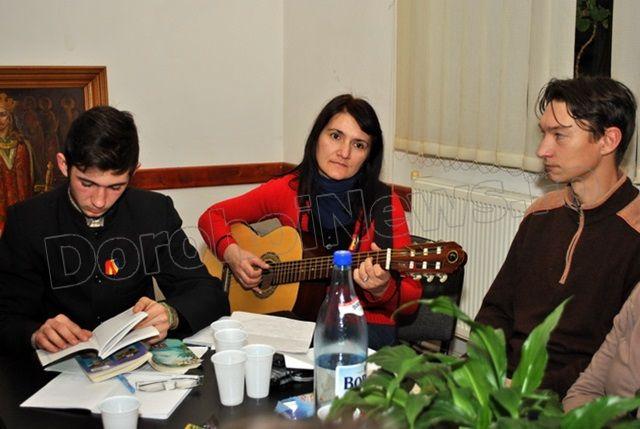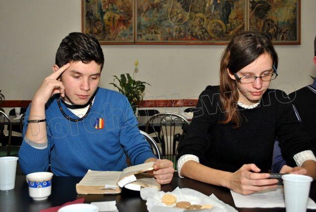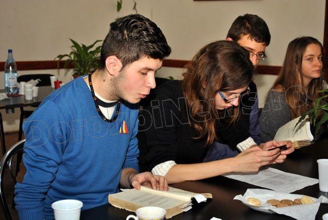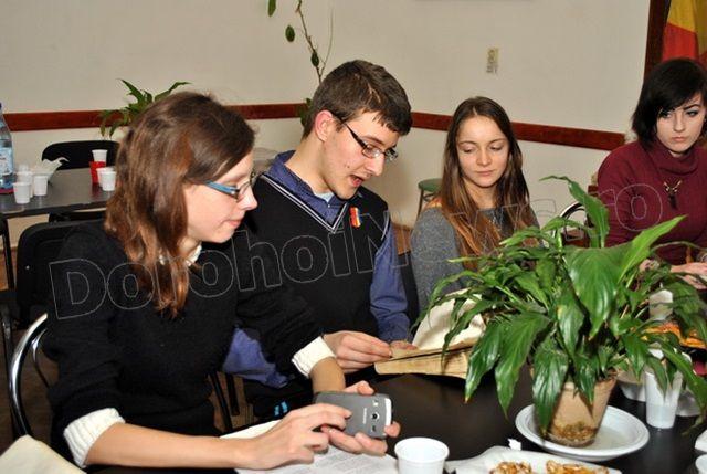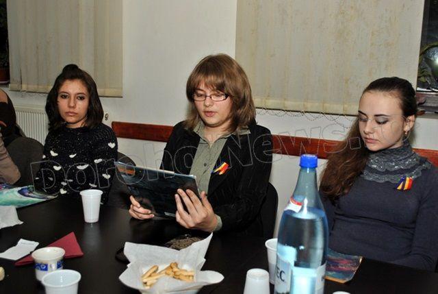 După câteva cântece și depunerea florilor la bustul marelui poet, ședința a început cu programul elevilor (VI-VII) de la Școala Generală nr. 4 Dorohoi, coordonaţi de prof. Suceveanu Tatiana. Programul lor a fost format din recitarea unor poezii ale lui Eminescu, cum ar fi: “Ce te legeni codrule”, “Somnoroase păsărele”, “Revedere”, câteva strofe din “Luceafarul”, etc. După aceste încântătoare poezii, cei mici ne-au surprins cu o scenetă, “O ședință la Cenaclul Junimea”.