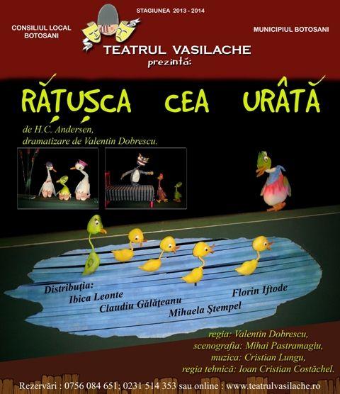 Vă invităm la Teatrul pentru Copii şi Tineret „Vasilache” duminică, 23 februarie 2014 de la ora 11:00 dar şi de la ora 12:30, să vizionaţi spectacolul „Răţuşca cea urâtă” de Hans Cristian Andersen.
