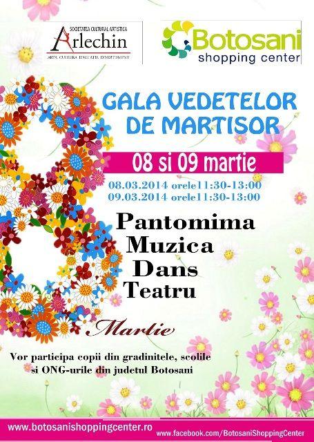 Festivalul Judetean de divertisment „Gala Vedetelor de Martisor” se afla la editia a VIII a si va fi organizat de catre Asociatia Culturala ARLECHIN Botosani si Fundatia Judeteana pentru Tineret Botosani în colaborare cu BOTOSANI SHOPPING CENTER în zilele de 8 – 9 Martie 2014, sub forma unor spectacole de divertisment muzical – coregrafice, unde copii, elevii si tinerii (de la gradinitele, scolile, liceele si ONG-urile partenere din judetul Botosani) vor oferi premii si diplome de excelenta mamelor si doamnelor (educatoare, invatatoare, profesoare), care i-au promovat si s-au implicat in viata artistica, sociala, sportiva a acestora, pe tot parcursul anului scolar 2013, programul festivalului cuprinde momente de muzică, dans, teatru, balet, gimnastica. Tot în cadrul acestui eveniment vor fi premiaţi primii cursanti ai Scolii de Film si Televiziune ARLECHIN Botosani şi va fi lansată Campania umanitară „Din dragoste pentru comunitate” a declarat Flavius Alin Damean, coordonator festival.