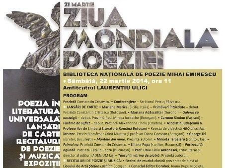 Memorilaul Ipotești – Centrul Național de studii Mihai Eminescu în parteneriat cu Teatrul Mihai Eminescu Botoșani, Cenaclul literar EDITOR - Dorohoi, Liceul de Artă Ştefan Luchian Botoșani şi Colegiul Național A.T. Laurian Botoșani, vă invită la activităţile prilejuite de ZIUA MONDIALĂ A POEZIEI – POEZIA ÎN LITERATURA UNIVERSALĂ, care vor avea loc sâmbătă, 22 martie 2014, începând cu ora 11:00, în incinta Bibliotecii Naţionale de Poezie Mihai Eminescu – Amfiteatrul Laurenţiu Ulici.