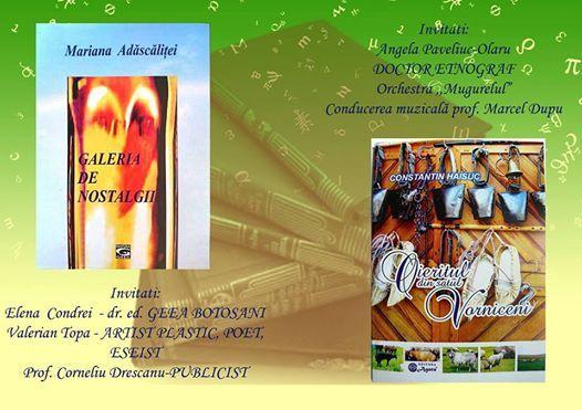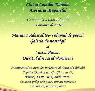 Clubul Copiilor Dorohoi și Asociația Mugurelul, vă invită la o seară culturală, cu lansare de carte a Marianei Adăscăliței - volumul de poezii „Galeria de nostalgii” și a lui Costel Haisuc „Oieritul din satul Vorniceni”.