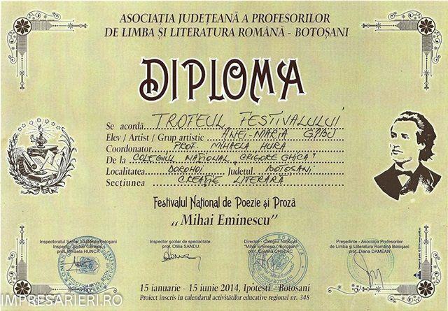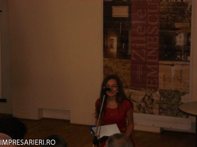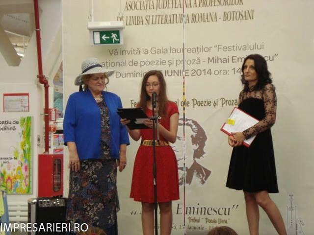 Activităţile zilei de 15 iunie au început la Ipoteşti, la Centrul de Studii M. Eminescu, unde, într-un cadru adecvat, în faţa membrilor Uniunii Scriitorilor din România, organizatorii festivalului au prezentat câştigătorii concursurilor şi au înmânat trofeul concurentei la trei secţiuni ( poezie, proză, recital muzical), Ana-Maria Gîbu de la Colegiul Naţional Grigore Ghica, Dorohoi. “Pentru mine a fost una dintre cele mai frumoase zile din viaţa mea! Pentru ca s-a întâmplat acasă, acasă la mine, în judeţul meu! Ce mult îmi doream să arăt tuturor celor care mă iubesc şi mă apreciază din ţară şi străinătate că şi la Botoşani se întâmplă lucruri minunate, făcute de OAMENI minunaţi!”, a declarat câştigătoarea trofeului.