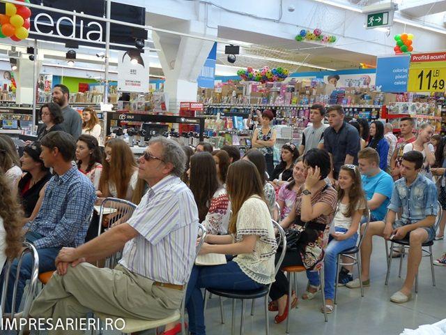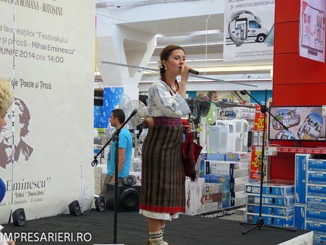 Echipa s-a deplasat mai apoi la Carrefour Botoşani, unde a avut loc spectacolul omagial Dor de Eminescu şi a continuat festivitatea de premiere. Iniţial reticienţi la un astfel de spaţiu, care nu este amenajat pentru astfel de manifestări, cei prezenţi au avut plăcuta surpriză să găsească toate condiţiile necesare: o mică scenă improvizată pe culoarul dintre rafturi, o imensă masă cu volume de poezii de Eminescu, scaune moderne pentru public, decor adecvat momentului artistic şi celui de gală, echpament pentr sonorizare; cel mai mult a contat bunăvoinţa celor de la Carrefour Botosani de a sprijini activitatea, de a-şi da interesul pentru ca aceia care vin să se simtă bine, oferind până şi dulciuri copiilor, multumim pe aceasta cale domnului director Iustinian Olariu si doamnei Diana Maxim. Spectacolul omagial a fost susţinut de elevi de la Colegiul Naţional M. Eminescu, Colegiul Naţional AT Laurian, Liceul Teoretic Petru Rareş şi Şcoala Gimnazială nr. 7 Botoşani. Texte eminesciene alese de elevi, recitate cu talent, au scos la iveală izvoarele romantice de inspiraţie, au reamintit tuturor de valoarea operei, actualitatea acesteia ( atâta timp cât dă glas sentimentului)şi a certificat faptul că oriunde poţi citi literatură ori asculta muzică. Vechiul „ să introducem cultura la sate” poate fi reiterat acum sub forma „ să introducem cultura în hipermarchet”, atâta timp cât oamenii aici îşi petrec majoritatea timpului ori doar acolo ar avea timp şi dispoziţie să audă puţină poezie. Invitaţi speciali au fost Iustina Irimia Cenuşă şi Teodor Cenuşă, care au susţinut un moment folcloric şi de muzică folk.,,Cel mai spectaculos moment al activităţii şi cel mai neaşteptat a fost prezenţa doamnei Lucia Olaru Nenatti.