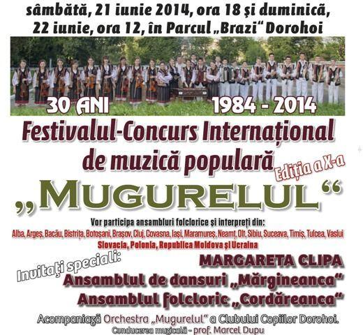 Iubitorii de folclor sunt așteptați astăzi, 21 iunie 2014, începând cu ora 18:00, în Parcul „Brazi” din Dorohoi, unde se va desfăşura cea de-a X-a ediţie a Festivalului Internaţional de muzică populară „Mugurelul” Dorohoi.